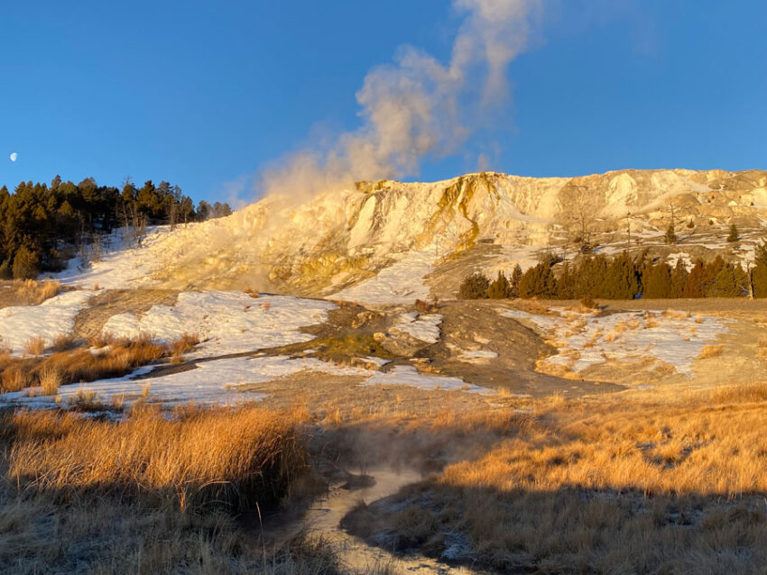 This is a winter of limited snowpack for Yellowstone Park’s northern tier landscapes. We will certainly come to rue this lack of usual winter weather next summer, but it’s made travel from the park’s north entrance near Gardiner, Montana, to Cooke City, Montana, easy to do. Consequently, I’ve been able to readily explore Mammoth’s hot spring systems and to watch park animals in their winter habitats. The following photos of both hot springs and animals are from my various park visits this winter.