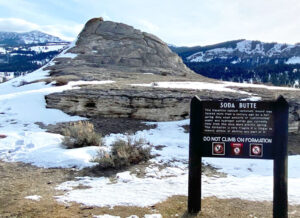 Soda Butte is a largely dormant thermal spring mound, located about 2.5 miles above the confluence of Soda Butte Creek with the Lamar River and approximately 12 miles from the Park’s northeastern gate. A. Bart Henderson, in 1866, misidentified the cone as composed of soda ash, rather than travertine (calcium carbonate), but the name has stuck. Some hydrothermal water and hydrogen sulfide gas still emanate from the cone. In fact – some days a strong sulfur smell lingers around the cone area.